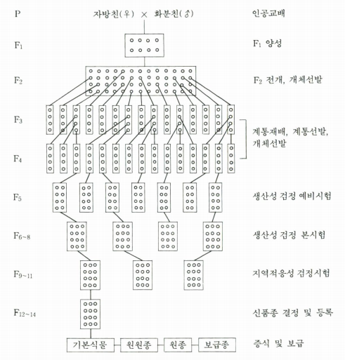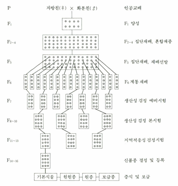 육종목표 설정 -> 육종재료 및 육종방법 결정 -> 변이작성 -> 우량계통 육성 -> 생산성 검정 -> 지역적응성 검정 -> 신품종 결정 및 등록 -> 종자증식 -> 신품종 보급