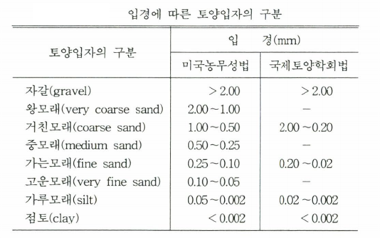 토양은 크고 작은 여러 입자(粒子)로 구성되어 있는데, 토양입자를 입경(粒徑)에 따라 구분한 것이 아래 표이다.